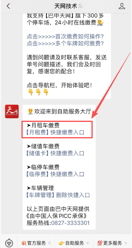 >i **月租车到期时间查询** >这里将用图文形式介绍如何查询月租车到期时间 --- ==温馨提示==: 巴中天网微信公众号为官方`在线缴费唯一电子渠道`,除此之外任何形式的网上缴费均为假冒,请车主一定要提高警惕。 >d **公众号名称:天网技术** > **认证企业:巴中市天网数字技术有限公司** > 服务热线:0827-3333301 --- #### 第一步:微信公众号中点月租缴费  --- #### 第二步:查询对应停车场的结束时间  --- 这里我们可以看到结束时间为2025-11-05 即代表为`2025年11月5日到期`