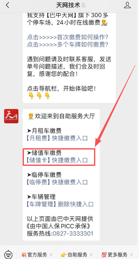 >i **储值车余额查询** >这里将用图文形式介绍储值车余额如何查询 --- ==温馨提示:== 巴中天网微信公众号为官方`在线缴费唯一电子渠道`,除此之外任何形式的网上缴费均为假冒,请车主一定要提高警惕。 >d **公众号名称:天网技术** > **认证企业:巴中市天网数字技术有限公司** > 服务热线:0827-3333301 --- #### 第一步:微信公众号中点储值缴费  --- #### 第二步:查询对应停车场的余额  --- 红圈这里可以看到显示160元, 即代表`该储值车剩余的余额为160元`