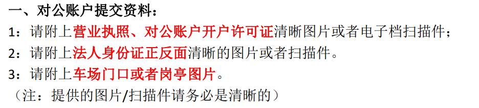 >i **感谢使用巴中天网云停车管控系统** 以下将介绍开通对公收款的准备材料及流程 --- ==对公电子支付开通流程== 1. 下载申请表,打印出来后,填写好表格中的内容 2. 准备好必要证件照片(具体哪些证件查看申请表下方说明) 3. 证件拍照即可,若为复印件必须要盖鲜章 4. 材料准备完成后,将所有材料拍照提交给大区经理 5. 电子支付开通由巴中天网内部申请,资料完整的情况下,预计10分钟内开通完成 --- **点击下方附件下载申请表↓↓↓:** [【附件】对(公)车场开通资料表-新版本.pdf](/media/attachment/2025/11/%E5%AF%B9%E5%85%AC%E8%BD%A6%E5%9C%BA%E5%BC%80%E9%80%9A%E8%B5%84%E6%96%99%E8%A1%A8-%E6%96%B0%E7%89%88%E6%9C%AC.pdf) ---  --- 相似的文章推荐: [对私收款申请表及开户流程介绍](https://help.0827110.com/doc/122/)