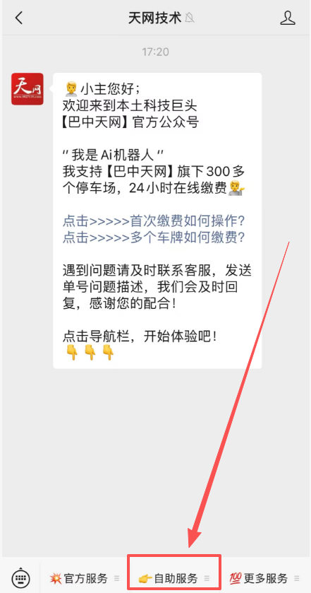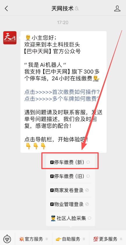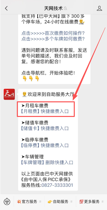 >i **【新版】月租费正常续费流程【图文介绍】** >本文档将介绍月租车日常缴费的操作流程图文介绍 --- ==温馨提示:== 巴中天网微信公众号为官方`在线缴费唯一电子渠道`,除此之外任何形式的网上缴费均为假冒,请车主一定要提高警惕。 >d **公众号名称:天网技术** >**认证企业:巴中市天网数字技术有限公司** >服务热线:0827-3333301 --- #### 第一步:打开公众号点自助服务  --- #### 第二步:选择停车缴费(新)  --- #### 第三步:选择月租缴费  --- #### 第四步:选择缴费停车场  --- #### 第五步:选择缴费几个月  --- #### 第六步:确认缴费月份  --- #### 第七步:确认后开始支付  --- #### 第八步:支付页面  ---